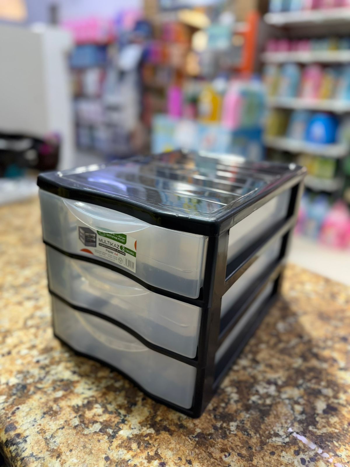 Casier de rangement en plastique avec 3 tiroirs, idéal pour organiser vos documents, accessoires ou objets du quotidien à la maison comme au bureau.