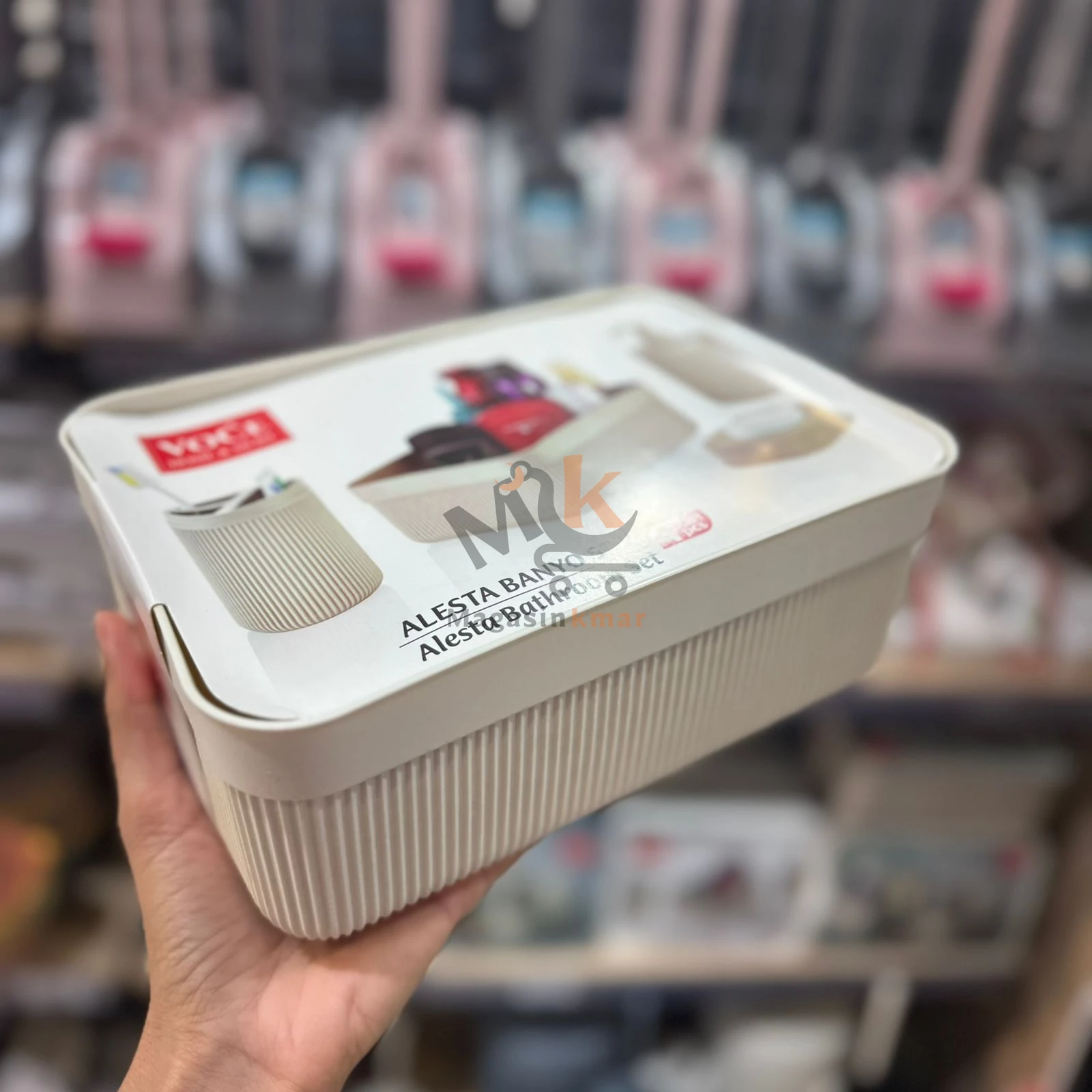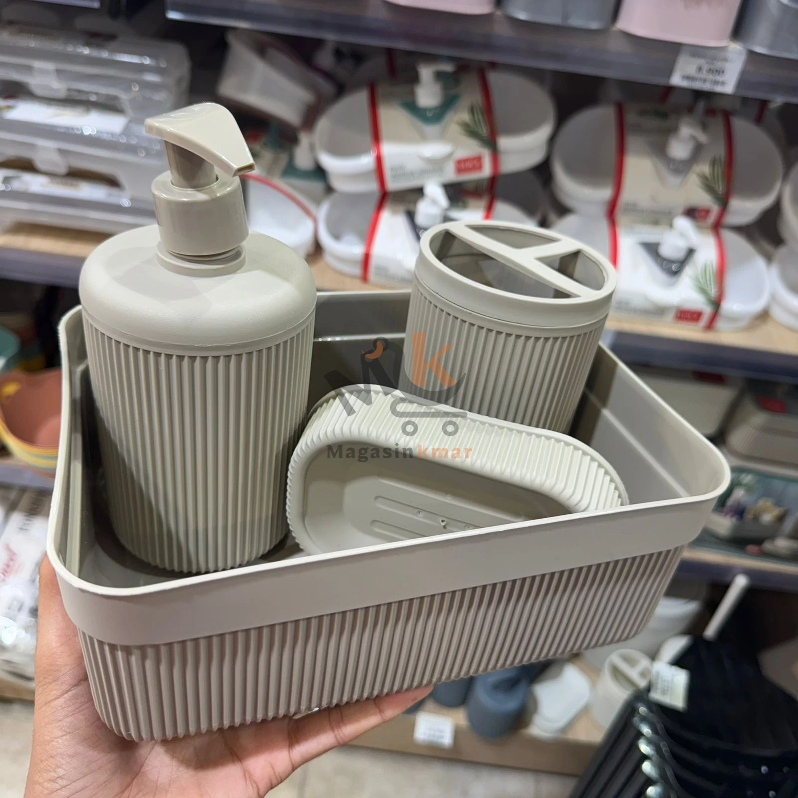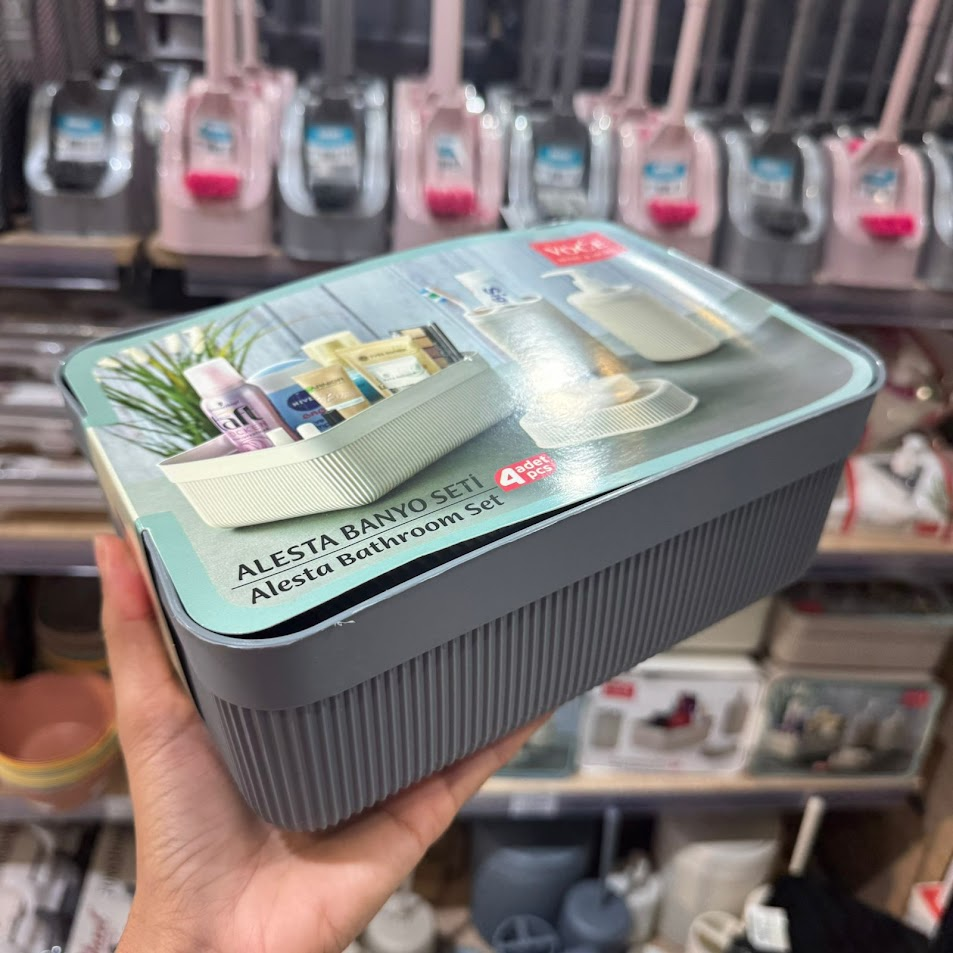 Pack salle de bain 5 pièces en plastique – Organisateur, distributeur, porte-savon et gobelet