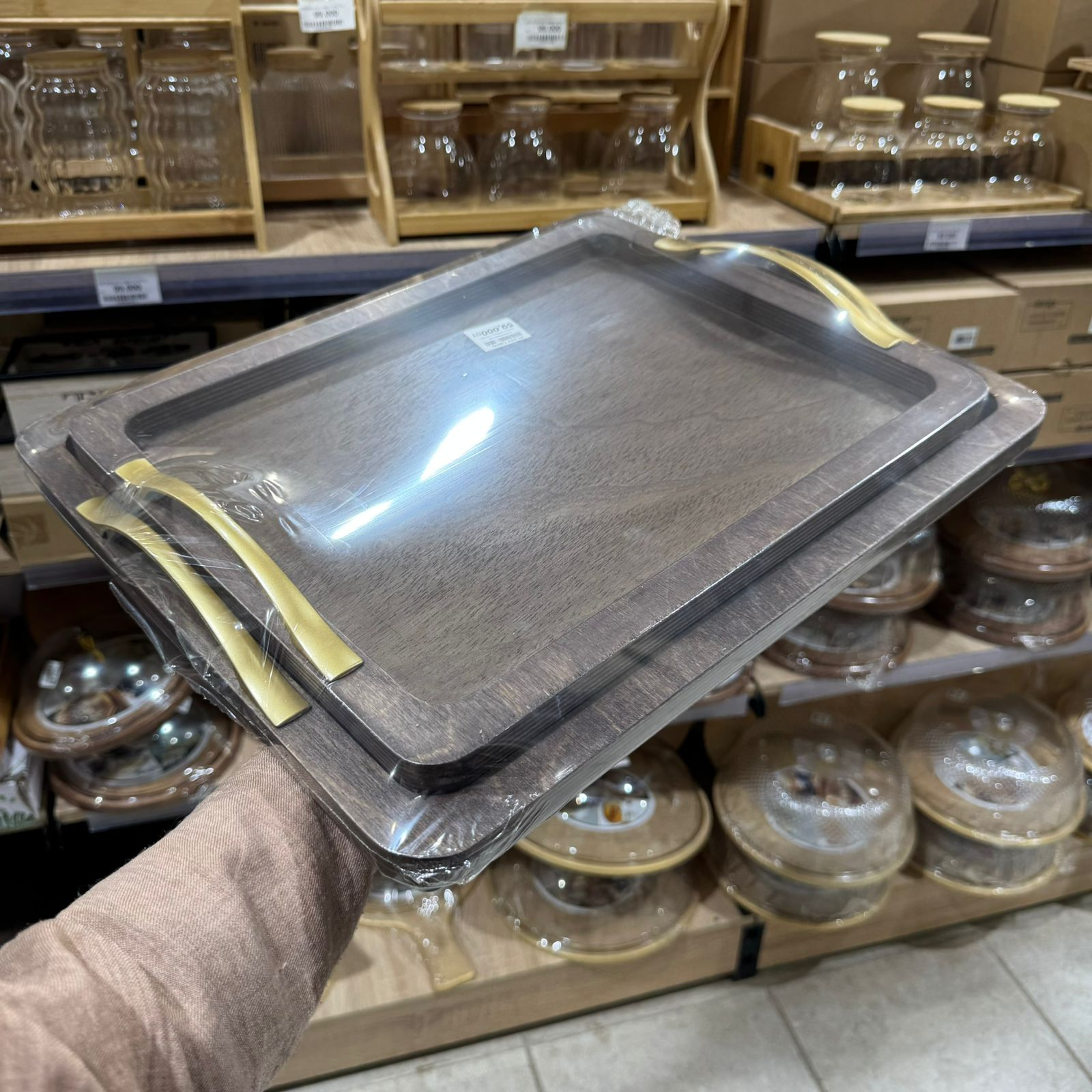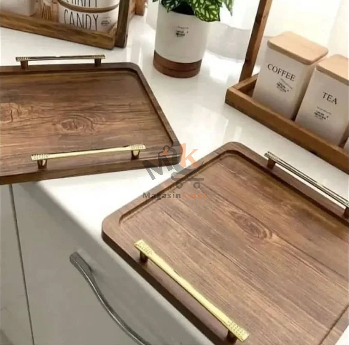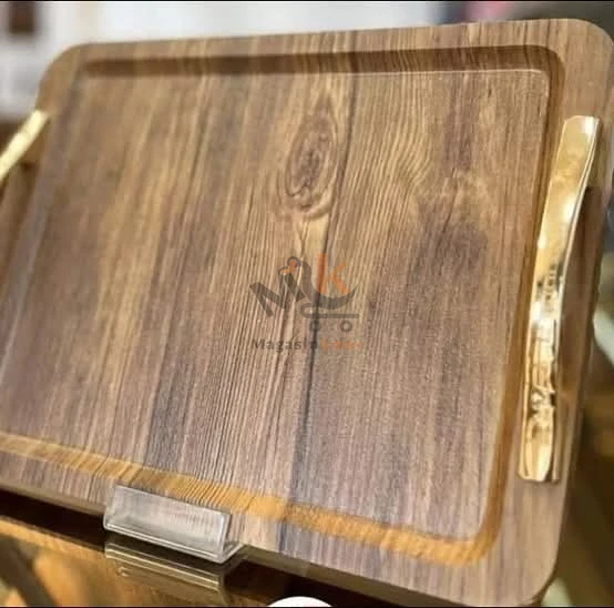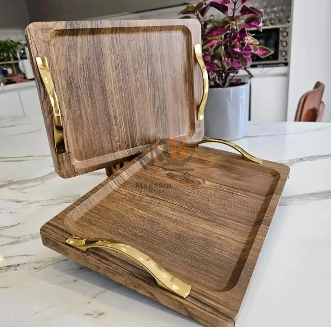 Série de 2 plateaux en bois avec poignées dorées