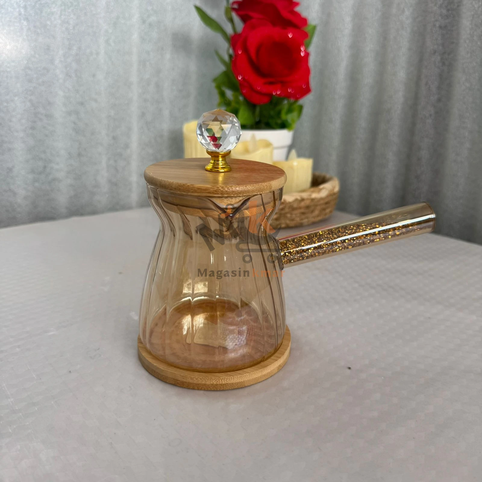 Zazoua dorée en verre avec couvercle en bois